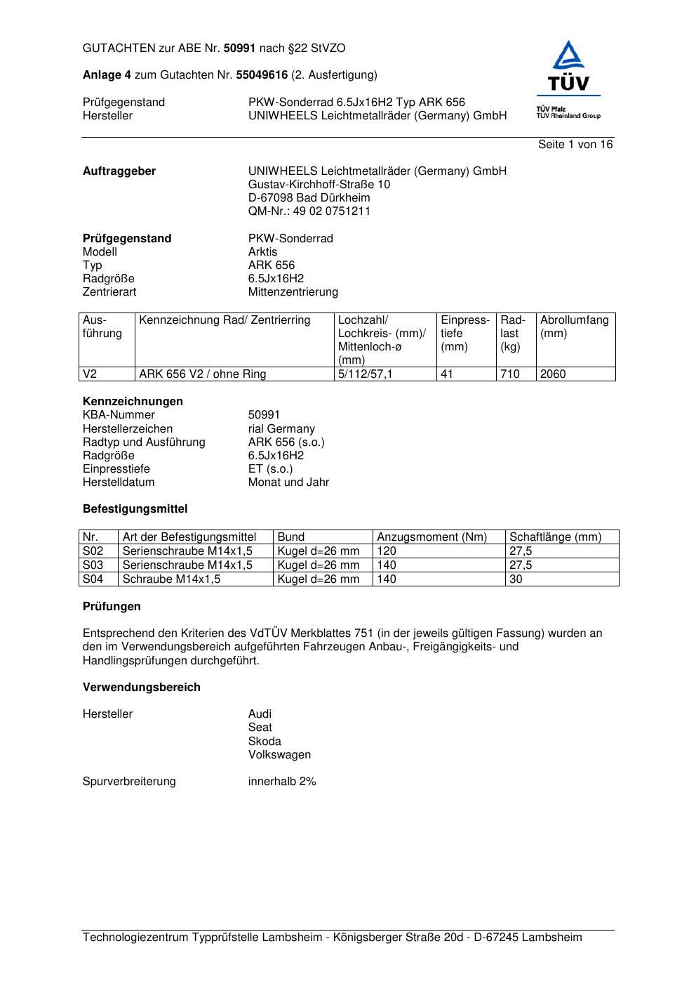 Dieses Gutachten (abe) bezieht sich auf die Alufelge brand-rial ARK 656 in der Ausführung 6.5Jx16 ET 0, Mittenloch 0 mm (KBA 50991). Im PDF findest du typischerweise zulässige Reifengrößen, Auflagen/Anbauhinweise und – je nach Dokument – Hinweise zur Eintragung.