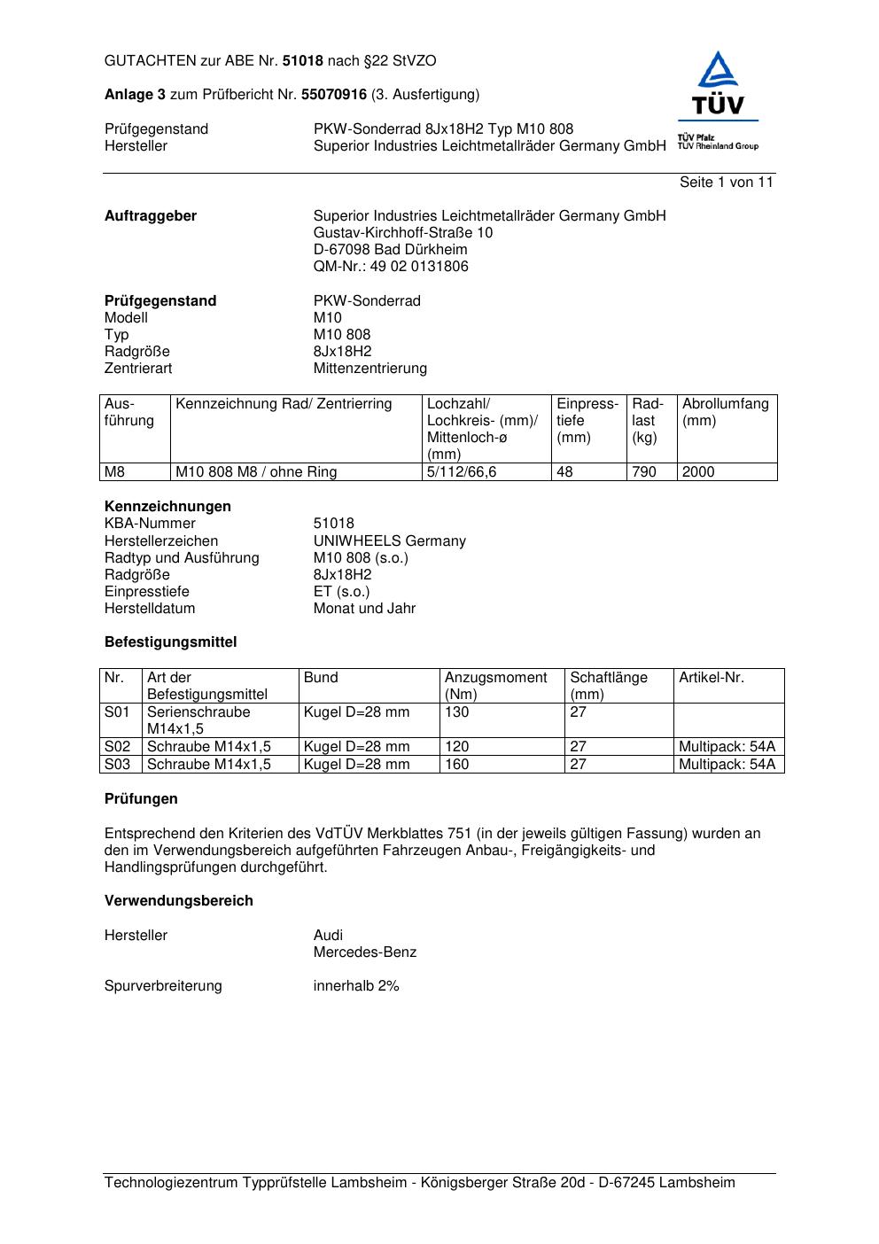 Dieses Gutachten (abe) bezieht sich auf die Alufelge Superior M10 808 in der Ausführung 8Jx18 ET 0, Mittenloch 0 mm (KBA 51018). Im PDF findest du typischerweise zulässige Reifengrößen, Auflagen/Anbauhinweise und – je nach Dokument – Hinweise zur Eintragung.