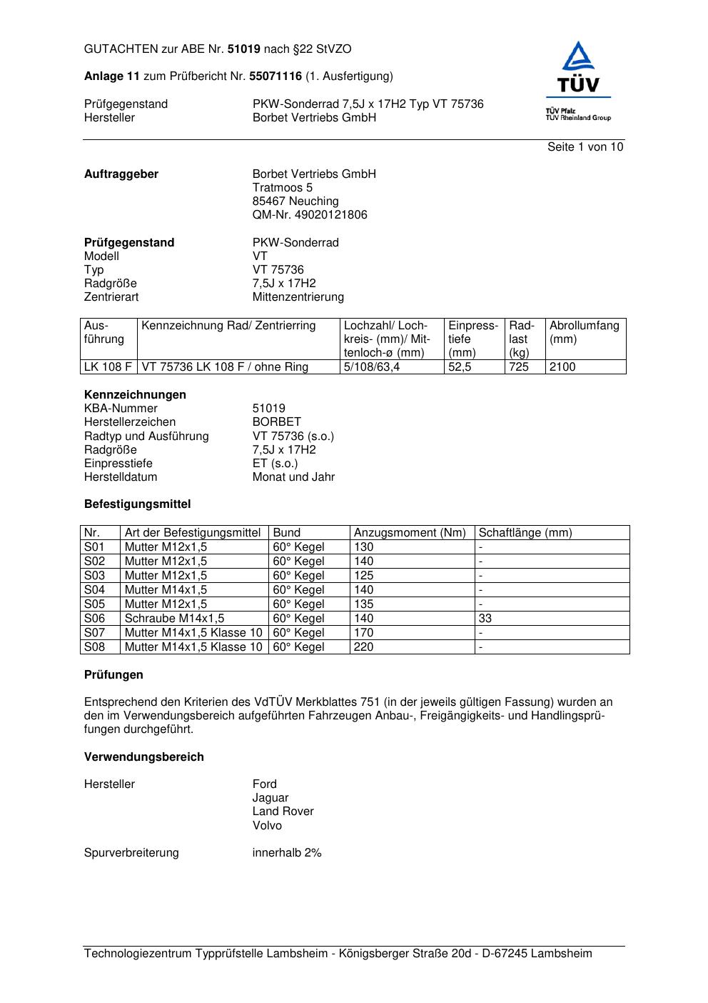 Dieses Gutachten (abe) bezieht sich auf die Alufelge Borbet VT 757 36 in der Ausführung 7.5Jx17 ET 0, Mittenloch 0 mm (KBA 51019). Im PDF findest du typischerweise zulässige Reifengrößen, Auflagen/Anbauhinweise und – je nach Dokument – Hinweise zur Eintragung.
