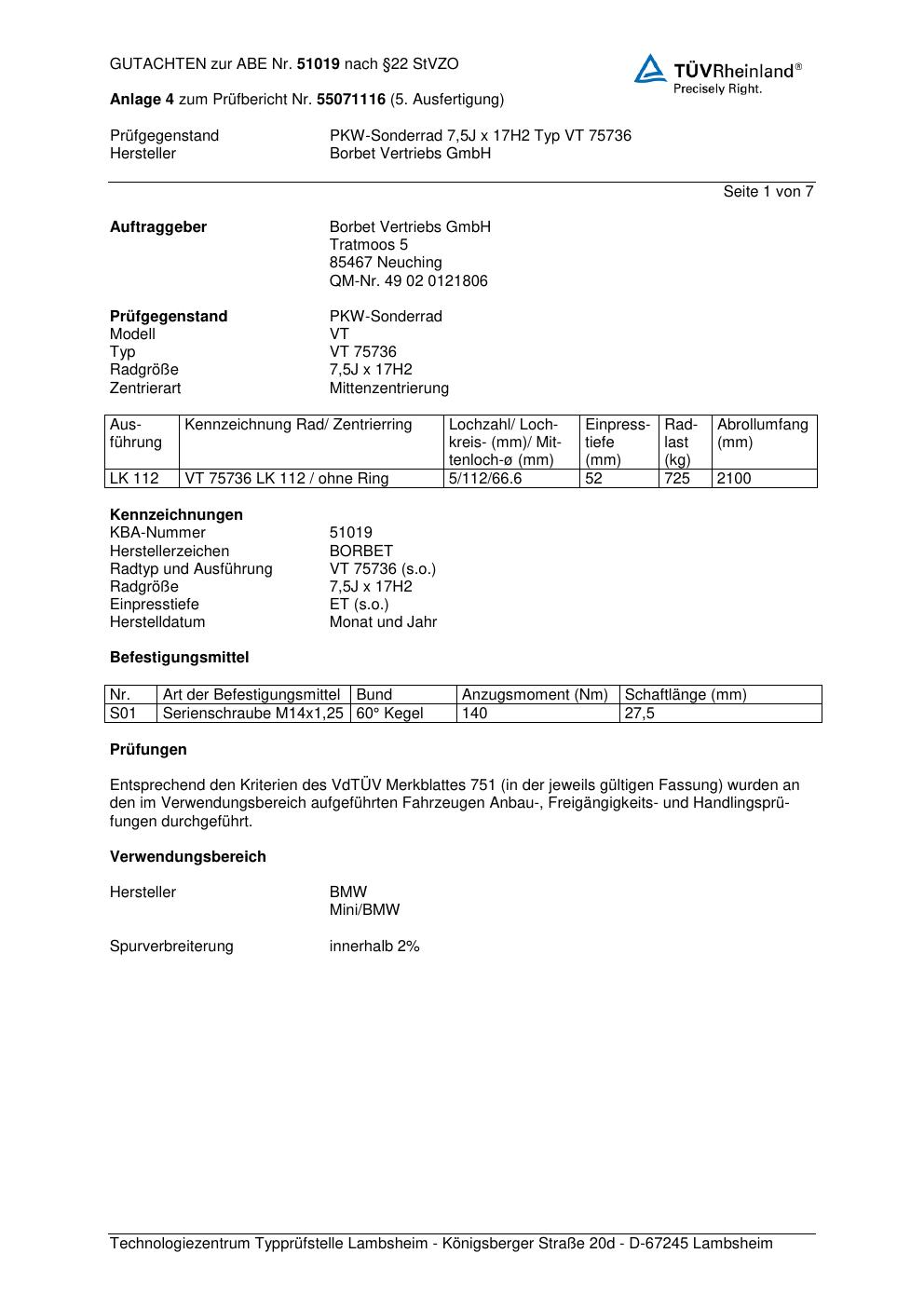 Dieses Gutachten (abe) bezieht sich auf die Alufelge brand-borbet VT 757 36 in der Ausführung 7.5Jx17 ET 0, Mittenloch 0 mm (KBA 51019). Im PDF findest du typischerweise zulässige Reifengrößen, Auflagen/Anbauhinweise und – je nach Dokument – Hinweise zur Eintragung.