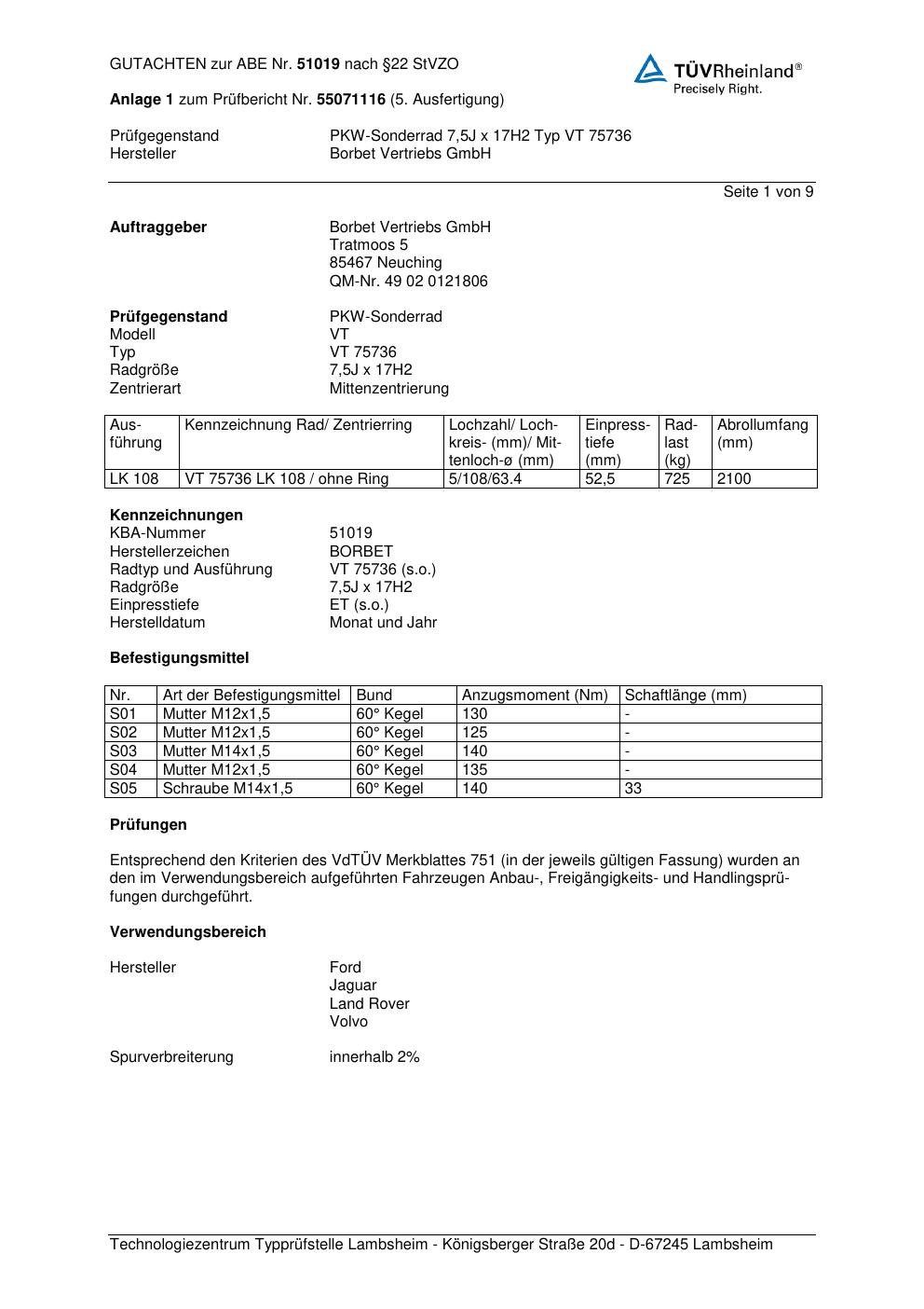 Dieses Gutachten (abe) bezieht sich auf die Alufelge Borbet VT 757 36 in der Ausführung 7.5Jx17 ET 0, Mittenloch 0 mm (KBA 51019). Im PDF findest du typischerweise zulässige Reifengrößen, Auflagen/Anbauhinweise und – je nach Dokument – Hinweise zur Eintragung.