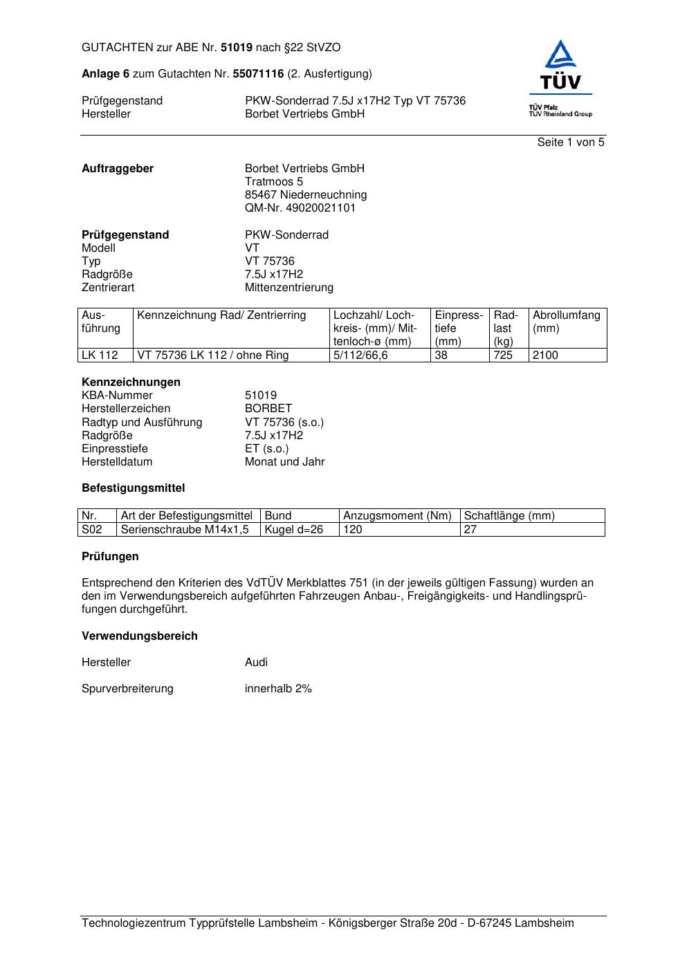 Dieses Gutachten (abe) bezieht sich auf die Alufelge Borbet VT 75736 in der Ausführung 7.5Jx17 ET 0, Mittenloch 0 mm (KBA 51019). Im PDF findest du typischerweise zulässige Reifengrößen, Auflagen/Anbauhinweise und – je nach Dokument – Hinweise zur Eintragung.