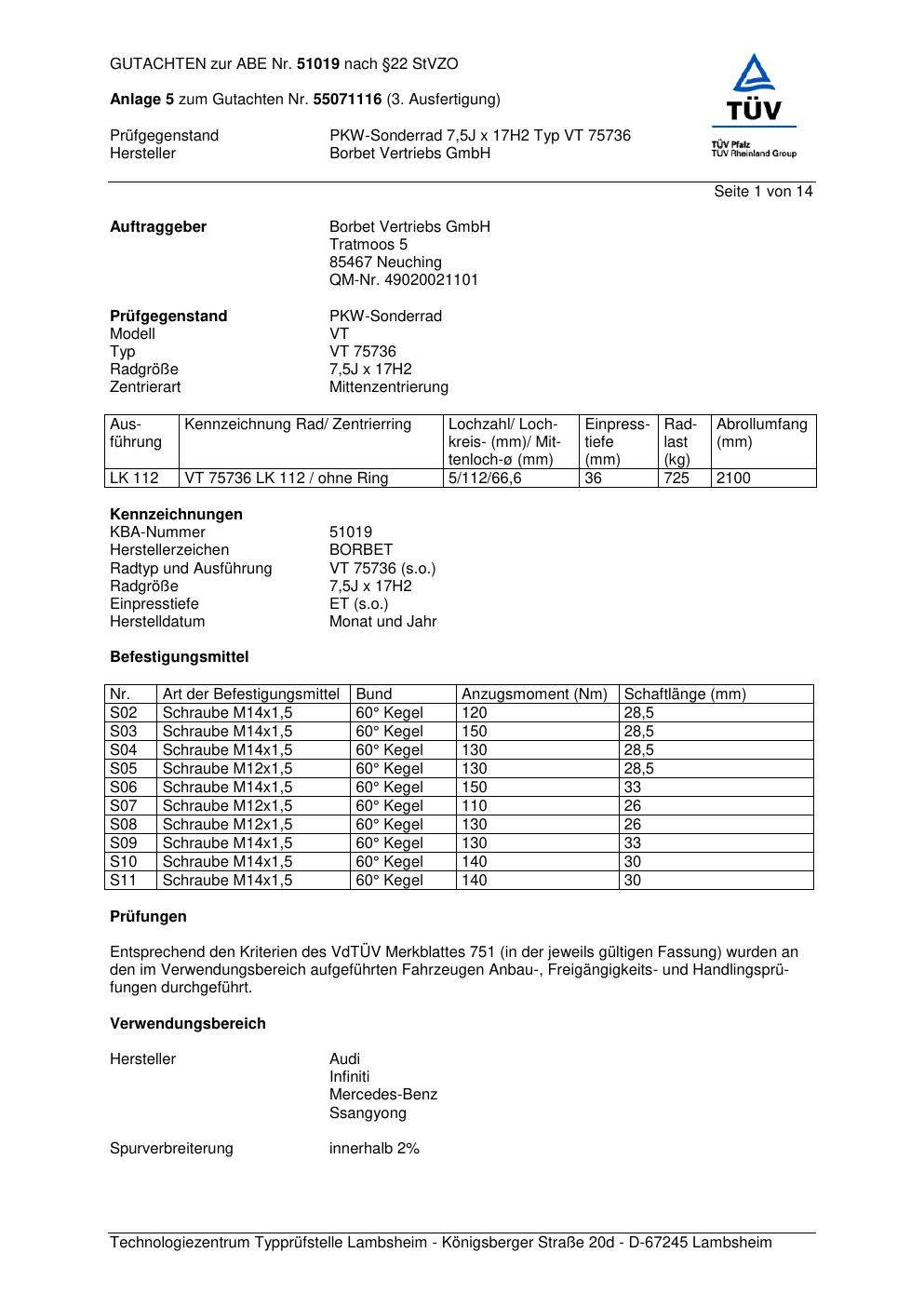 Dieses Gutachten (abe) bezieht sich auf die Alufelge brand-borbet VT 75736 in der Ausführung 7.5Jx17 ET 0, Mittenloch 0 mm (KBA 51019). Im PDF findest du typischerweise zulässige Reifengrößen, Auflagen/Anbauhinweise und – je nach Dokument – Hinweise zur Eintragung.