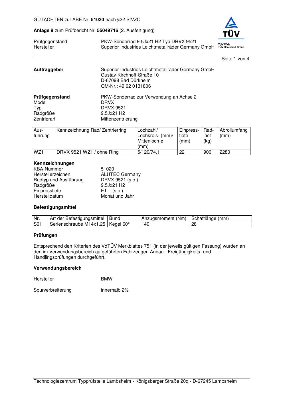 Dieses Gutachten (abe) bezieht sich auf die Alufelge ALUTEC DRVX 95 21 in der Ausführung 9.5Jx21 ET 0, Mittenloch 0 mm (KBA 51020). Im PDF findest du typischerweise zulässige Reifengrößen, Auflagen/Anbauhinweise und – je nach Dokument – Hinweise zur Eintragung.