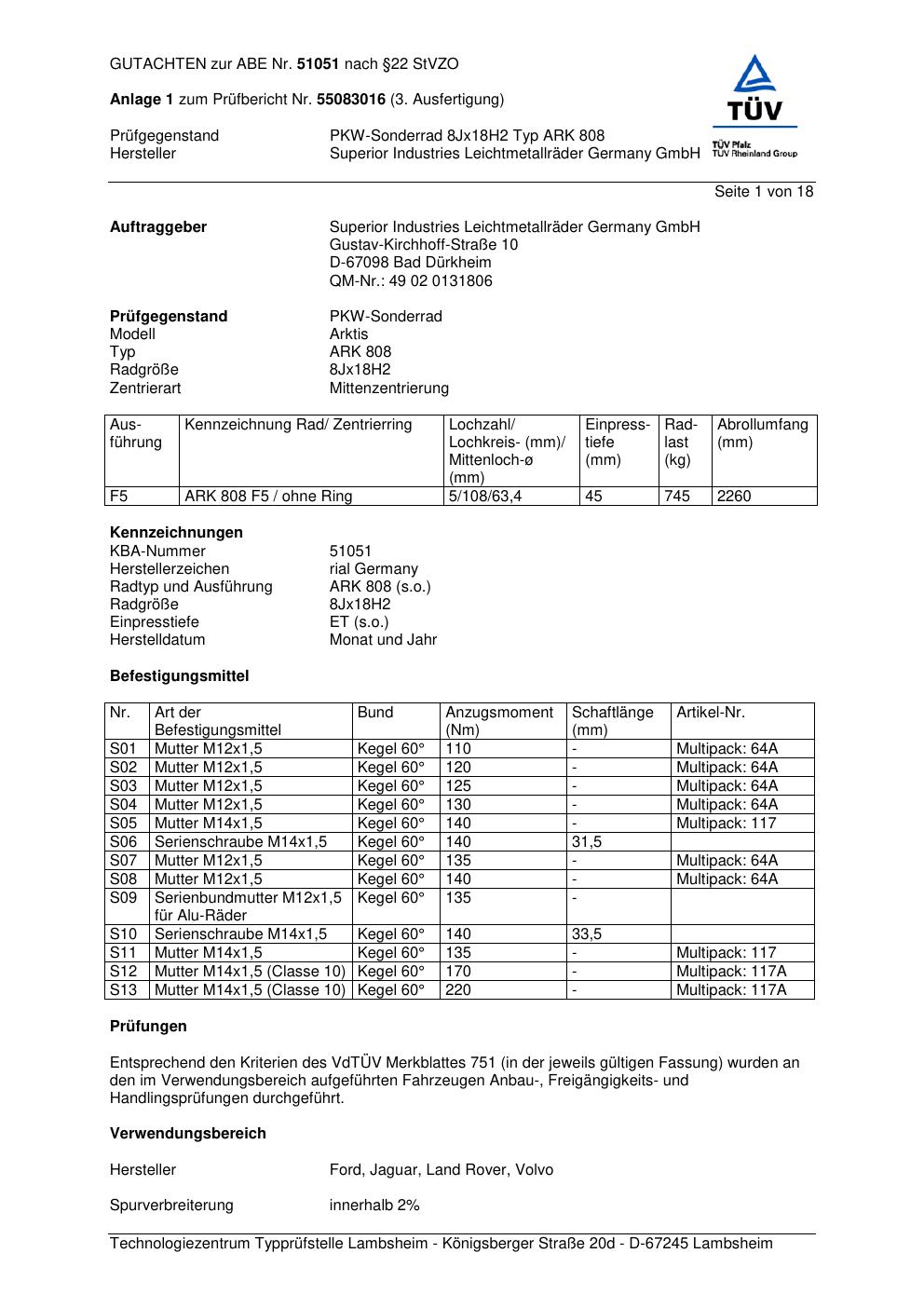 Dieses Gutachten (abe) bezieht sich auf die Alufelge brand-rial ARK 808 in der Ausführung 8Jx18 ET 0, Mittenloch 0 mm (KBA 51051). Im PDF findest du typischerweise zulässige Reifengrößen, Auflagen/Anbauhinweise und – je nach Dokument – Hinweise zur Eintragung.