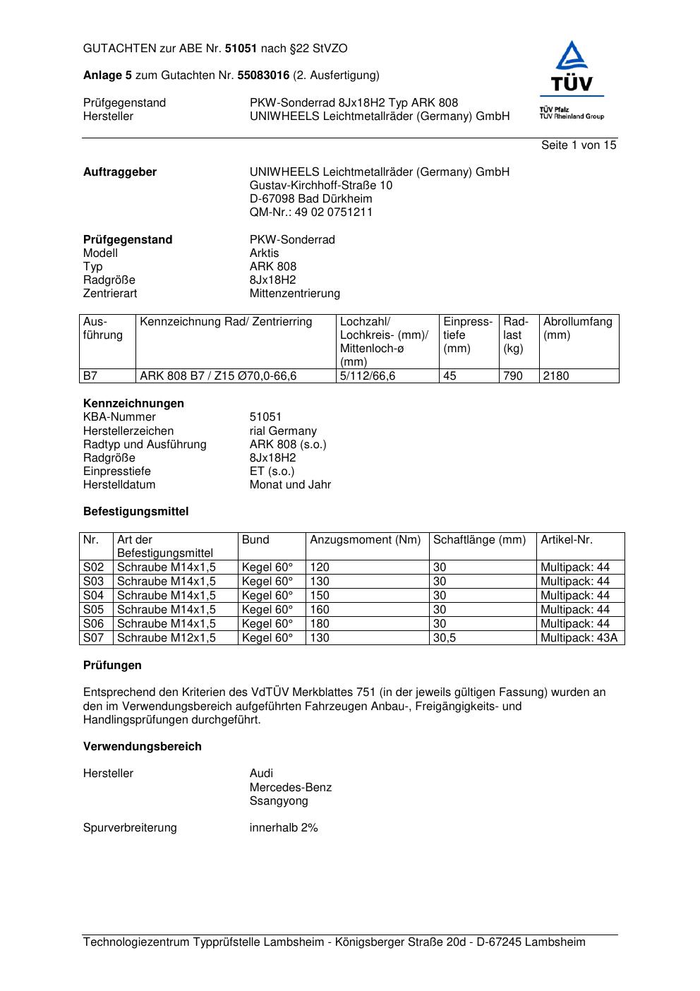 Dieses Gutachten (abe) bezieht sich auf die Alufelge brand-rial ARK 808 in der Ausführung 8Jx18 ET 0, Mittenloch 0 mm (KBA 51051). Im PDF findest du typischerweise zulässige Reifengrößen, Auflagen/Anbauhinweise und – je nach Dokument – Hinweise zur Eintragung.