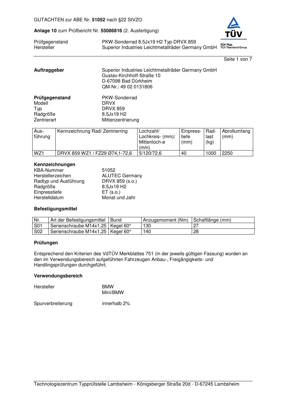 Dieses Gutachten (abe) bezieht sich auf die Alufelge ALUTEC DRVX 85 9 in der Ausführung 8.5Jx19 ET 0, Mittenloch 0 mm (KBA 51052). Im PDF findest du typischerweise zulässige Reifengrößen, Auflagen/Anbauhinweise und – je nach Dokument – Hinweise zur Eintragung.