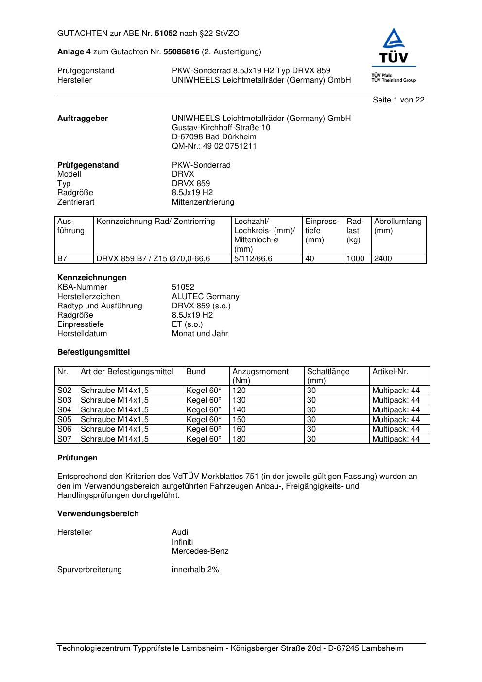 Dieses Gutachten (abe) bezieht sich auf die Alufelge ALUTEC DRVX 85 9 in der Ausführung 8.5Jx19 ET 0, Mittenloch 0 mm (KBA 51052). Im PDF findest du typischerweise zulässige Reifengrößen, Auflagen/Anbauhinweise und – je nach Dokument – Hinweise zur Eintragung.