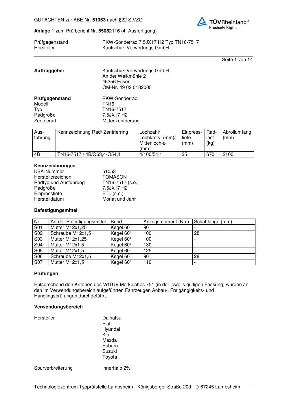 Dieses Gutachten (abe) bezieht sich auf die Alufelge ATS TN16-7517 in der Ausführung 7.5Jx17 ET 0, Mittenloch 0 mm (KBA 51053). Im PDF findest du typischerweise zulässige Reifengrößen, Auflagen/Anbauhinweise und – je nach Dokument – Hinweise zur Eintragung.