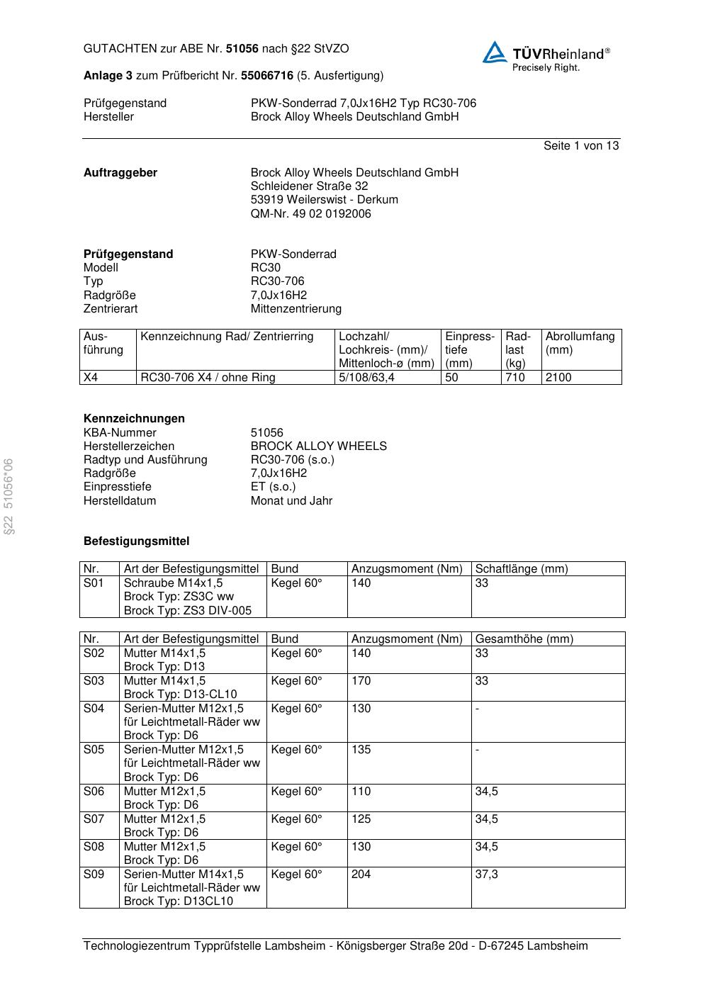Dieses Gutachten (abe) bezieht sich auf die Alufelge Brock RC30-706 in der Ausführung 7Jx16 ET 0, Mittenloch 0 mm (KBA 51056). Im PDF findest du typischerweise zulässige Reifengrößen, Auflagen/Anbauhinweise und – je nach Dokument – Hinweise zur Eintragung.