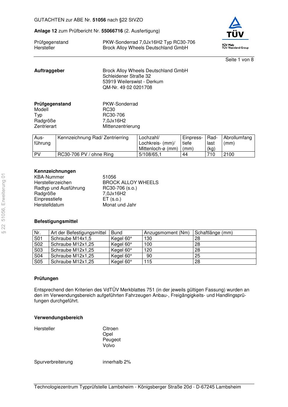 Dieses Gutachten (abe) bezieht sich auf die Alufelge Brock RC30-706 in der Ausführung 7Jx16 ET 0, Mittenloch 0 mm (KBA 51056). Im PDF findest du typischerweise zulässige Reifengrößen, Auflagen/Anbauhinweise und – je nach Dokument – Hinweise zur Eintragung.