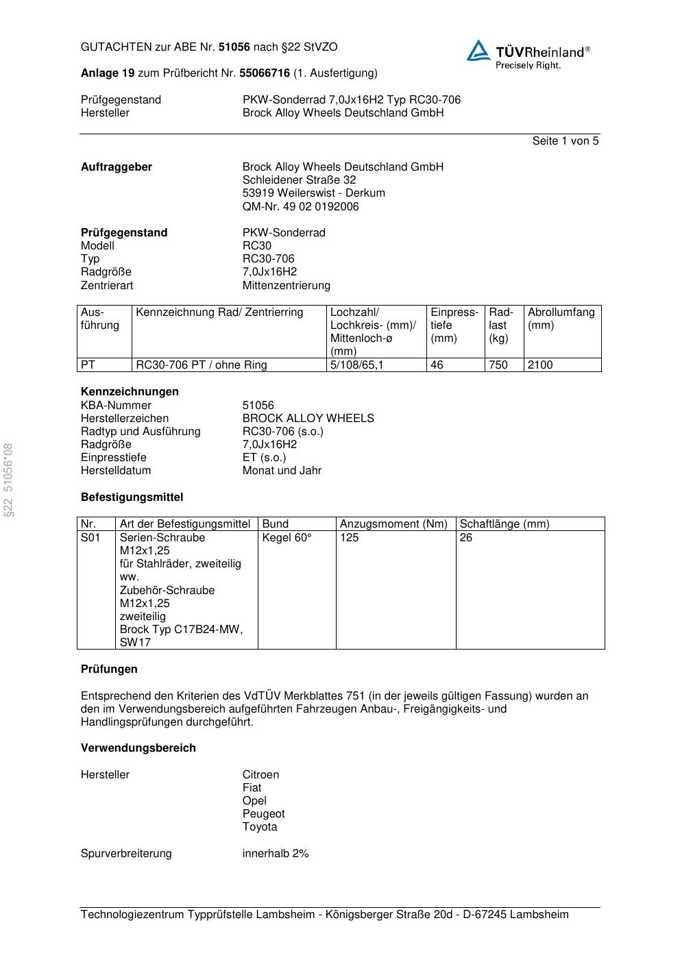 Dieses Gutachten (abe) bezieht sich auf die Alufelge Brock RC30-706 in der Ausführung 7Jx16 ET 0, Mittenloch 0 mm (KBA 51056). Im PDF findest du typischerweise zulässige Reifengrößen, Auflagen/Anbauhinweise und – je nach Dokument – Hinweise zur Eintragung.