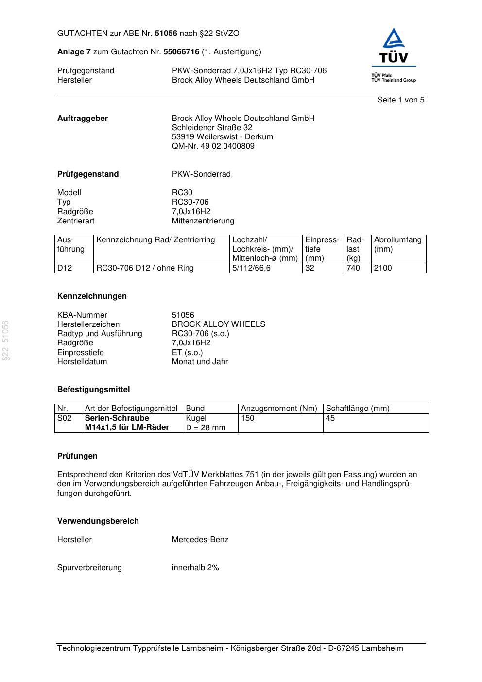 Dieses Gutachten (abe) bezieht sich auf die Alufelge Brock RC30-706 in der Ausführung 7Jx16 ET 0, Mittenloch 0 mm (KBA 51056). Im PDF findest du typischerweise zulässige Reifengrößen, Auflagen/Anbauhinweise und – je nach Dokument – Hinweise zur Eintragung.