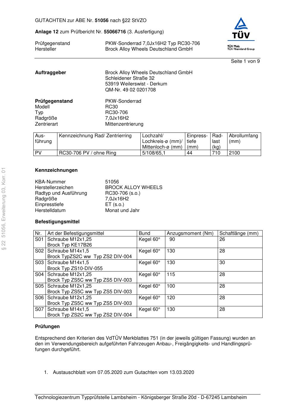 Dieses Gutachten (abe) bezieht sich auf die Alufelge Brock RC30-706 in der Ausführung 7Jx16 ET 0, Mittenloch 0 mm (KBA 51056). Im PDF findest du typischerweise zulässige Reifengrößen, Auflagen/Anbauhinweise und – je nach Dokument – Hinweise zur Eintragung.