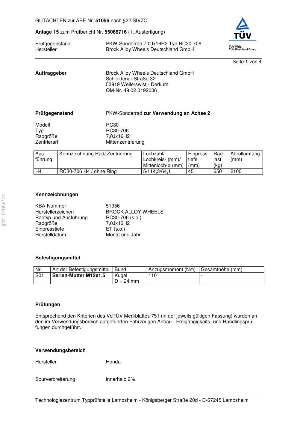 Dieses Gutachten (abe) bezieht sich auf die Alufelge Brock RC30-706 in der Ausführung 7Jx16 ET 0, Mittenloch 0 mm (KBA 51056). Im PDF findest du typischerweise zulässige Reifengrößen, Auflagen/Anbauhinweise und – je nach Dokument – Hinweise zur Eintragung.