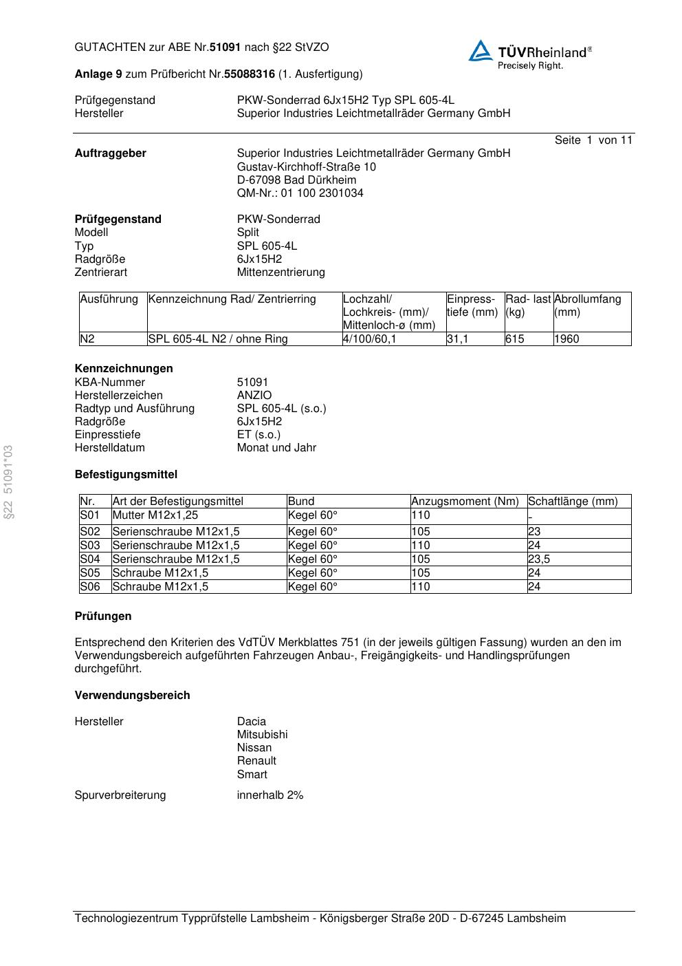 Dieses Gutachten (abe) bezieht sich auf die Alufelge brand-anzio SPL 605-4L in der Ausführung 6Jx15 ET 0, Mittenloch 0 mm (KBA 51091). Im PDF findest du typischerweise zulässige Reifengrößen, Auflagen/Anbauhinweise und – je nach Dokument – Hinweise zur Eintragung.
