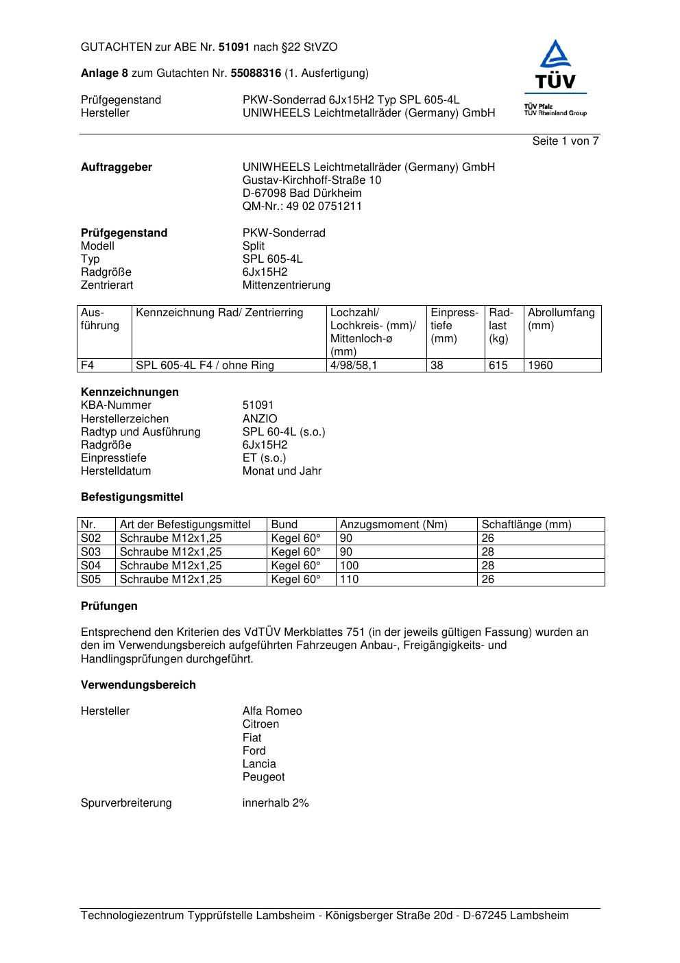 Dieses Gutachten (abe) bezieht sich auf die Alufelge brand-anzio SPL 605-4L in der Ausführung 6Jx15 ET 0, Mittenloch 0 mm (KBA 51091). Im PDF findest du typischerweise zulässige Reifengrößen, Auflagen/Anbauhinweise und – je nach Dokument – Hinweise zur Eintragung.