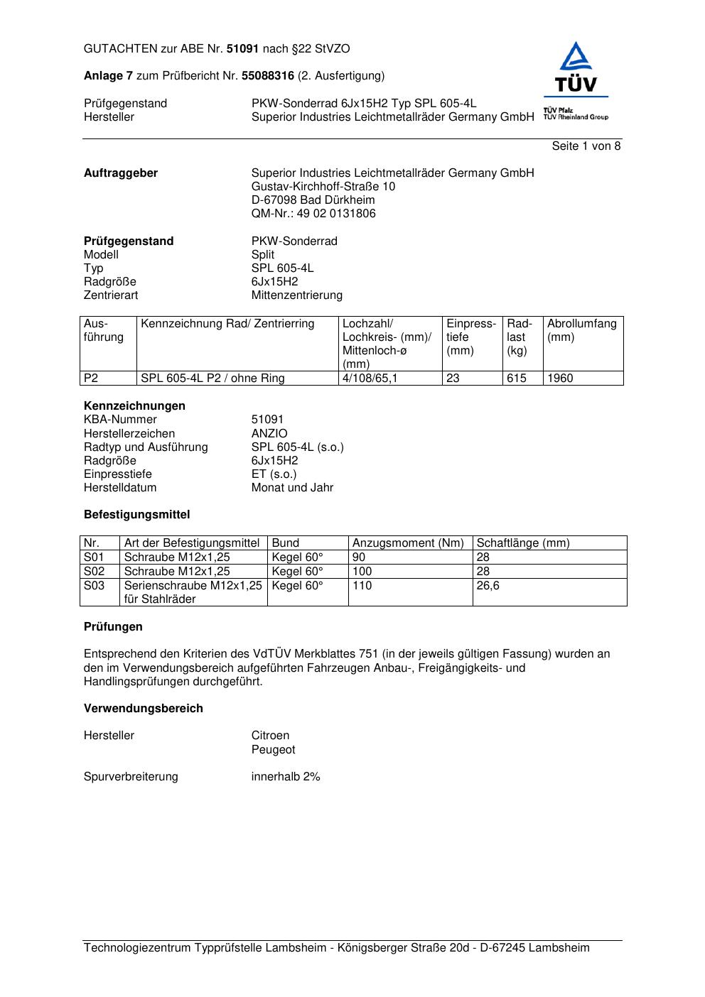 Dieses Gutachten (abe) bezieht sich auf die Alufelge brand-anzio SPL 605-4L in der Ausführung 6Jx15 ET 0, Mittenloch 0 mm (KBA 51091). Im PDF findest du typischerweise zulässige Reifengrößen, Auflagen/Anbauhinweise und – je nach Dokument – Hinweise zur Eintragung.
