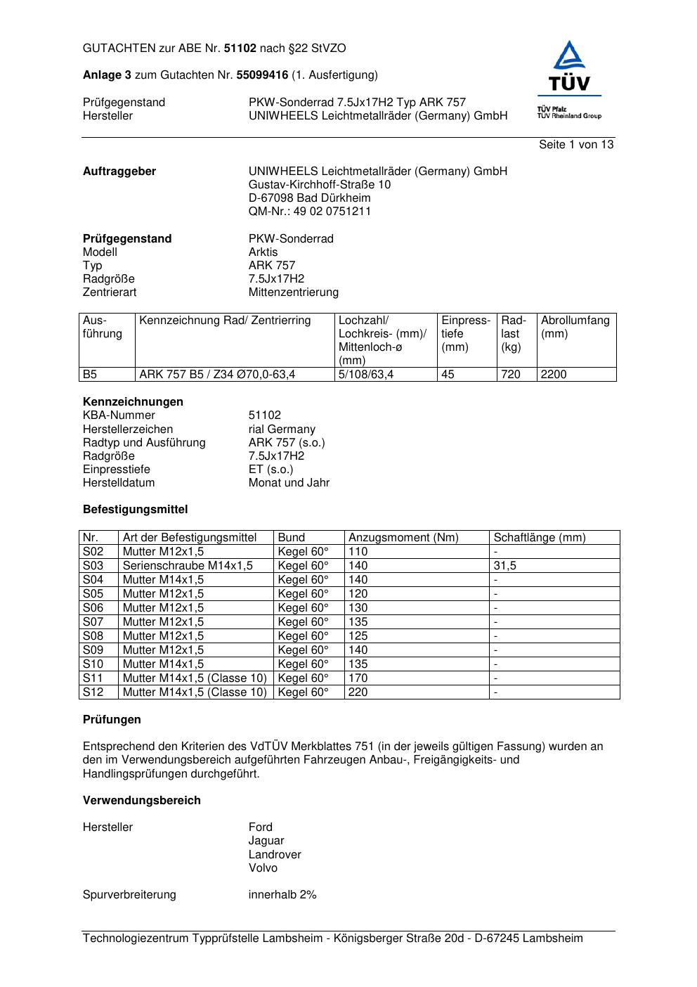 Dieses Gutachten (abe) bezieht sich auf die Alufelge brand-rial ARK 757 in der Ausführung 7.5Jx17 ET 0, Mittenloch 0 mm (KBA 51102). Im PDF findest du typischerweise zulässige Reifengrößen, Auflagen/Anbauhinweise und – je nach Dokument – Hinweise zur Eintragung.
