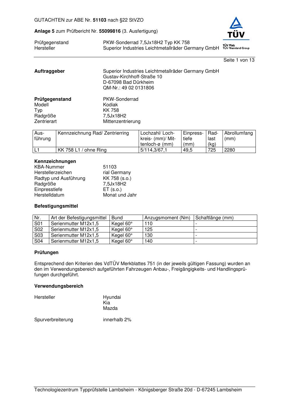 Dieses Gutachten (abe) bezieht sich auf die Alufelge brand-rial KK 758 in der Ausführung 7.5Jx18 ET 0, Mittenloch 0 mm (KBA 51103). Im PDF findest du typischerweise zulässige Reifengrößen, Auflagen/Anbauhinweise und – je nach Dokument – Hinweise zur Eintragung.