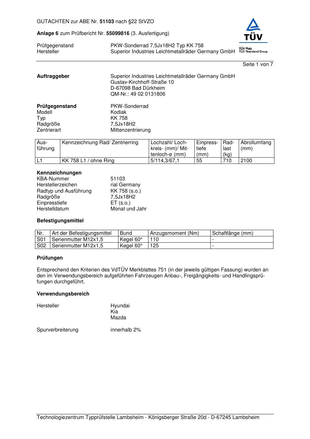 Dieses Gutachten (abe) bezieht sich auf die Alufelge brand-rial KK 758 in der Ausführung 7.5Jx18 ET 0, Mittenloch 0 mm (KBA 51103). Im PDF findest du typischerweise zulässige Reifengrößen, Auflagen/Anbauhinweise und – je nach Dokument – Hinweise zur Eintragung.