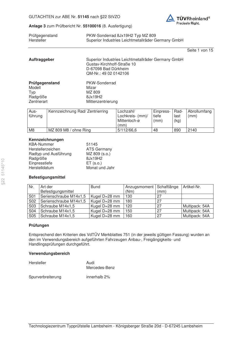 Dieses Gutachten (abe) bezieht sich auf die Alufelge ATS MZ 809 in der Ausführung 8Jx19 ET 0, Mittenloch 0 mm (KBA 51145). Im PDF findest du typischerweise zulässige Reifengrößen, Auflagen/Anbauhinweise und – je nach Dokument – Hinweise zur Eintragung.