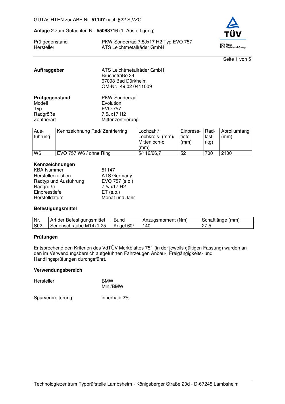 Dieses Gutachten (abe) bezieht sich auf die Alufelge ATS EVO 757 in der Ausführung 7.5Jx17 ET 0, Mittenloch 0 mm (KBA 51147). Im PDF findest du typischerweise zulässige Reifengrößen, Auflagen/Anbauhinweise und – je nach Dokument – Hinweise zur Eintragung.
