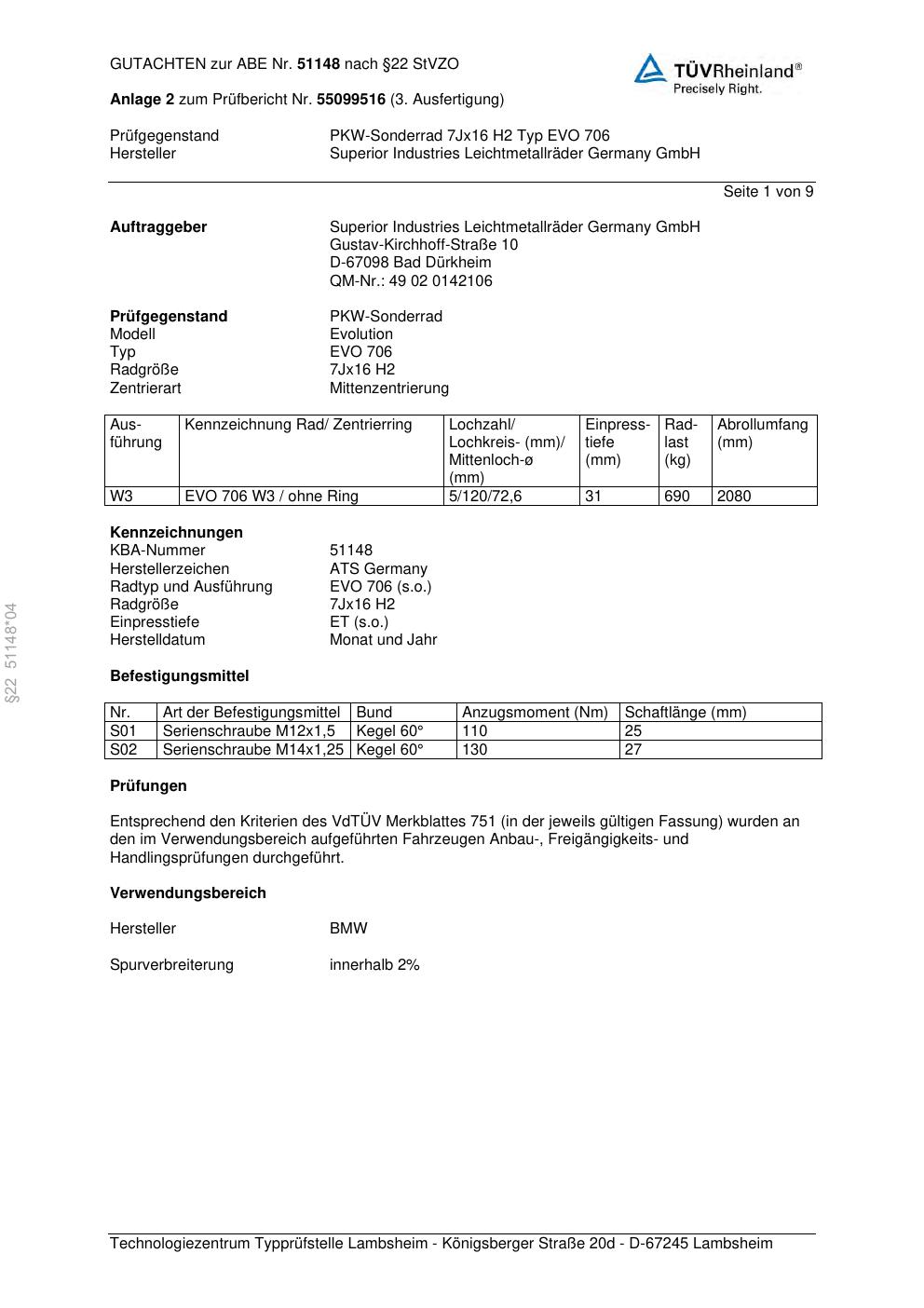 Dieses Gutachten (abe) bezieht sich auf die Alufelge ATS EVO 706 in der Ausführung 7Jx16 ET 0, Mittenloch 0 mm (KBA 51148). Im PDF findest du typischerweise zulässige Reifengrößen, Auflagen/Anbauhinweise und – je nach Dokument – Hinweise zur Eintragung.