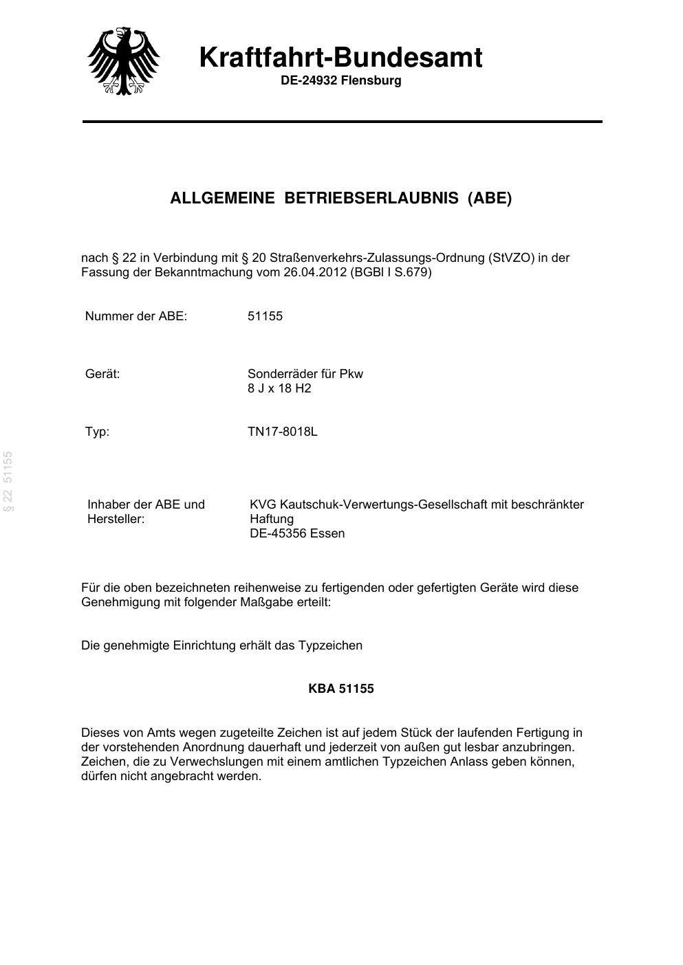 Dieses Gutachten (abe) bezieht sich auf die Alufelge ATS TN17 -8018L in der Ausführung 8Jx18 ET 0, Mittenloch 0 mm (KBA 51155). Im PDF findest du typischerweise zulässige Reifengrößen, Auflagen/Anbauhinweise und – je nach Dokument – Hinweise zur Eintragung.