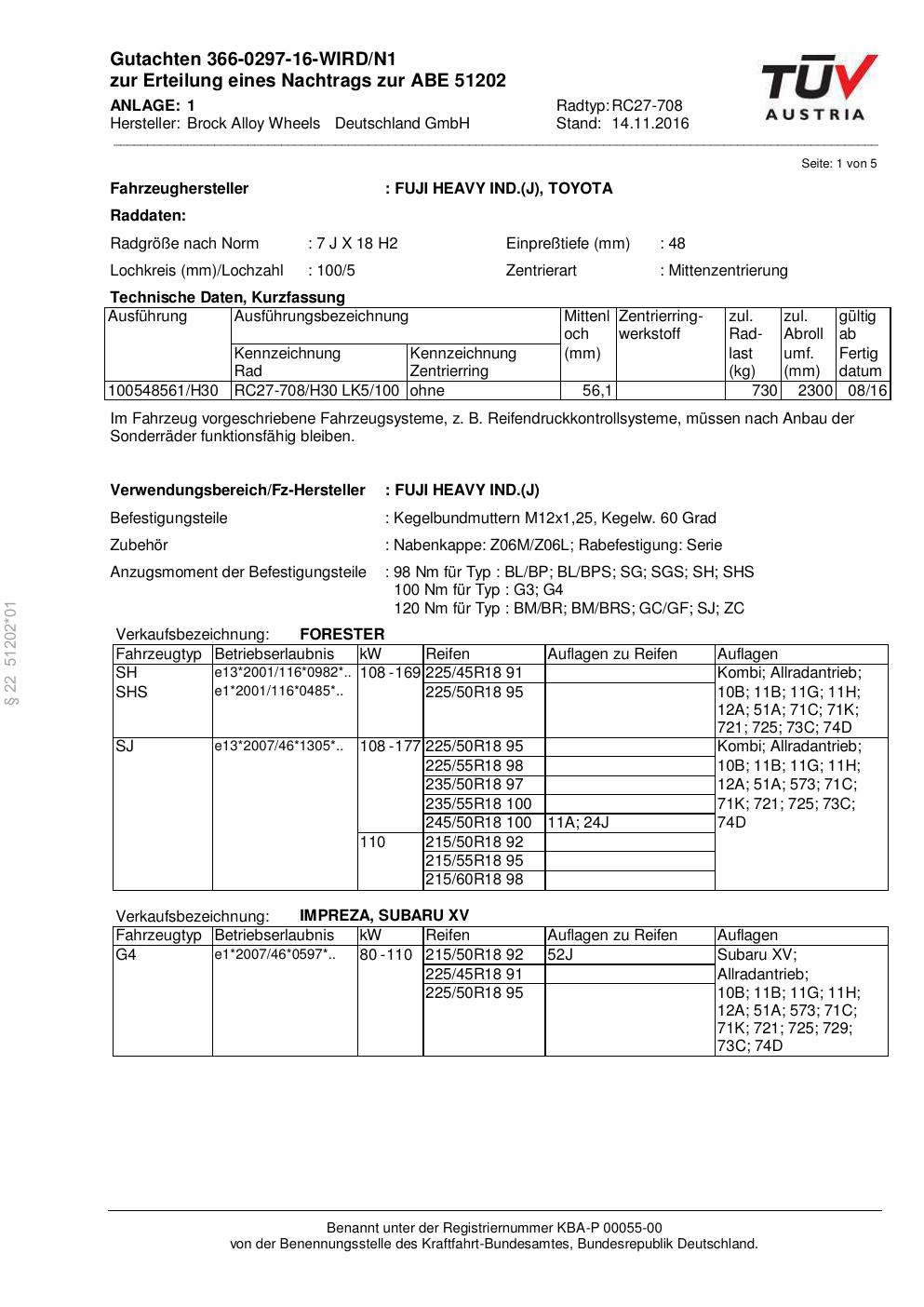 Dieses Gutachten (abe) bezieht sich auf die Alufelge Brock RC27-708 in der Ausführung 7Jx18 ET 0, Mittenloch 0 mm (KBA 51202). Im PDF findest du typischerweise zulässige Reifengrößen, Auflagen/Anbauhinweise und – je nach Dokument – Hinweise zur Eintragung.