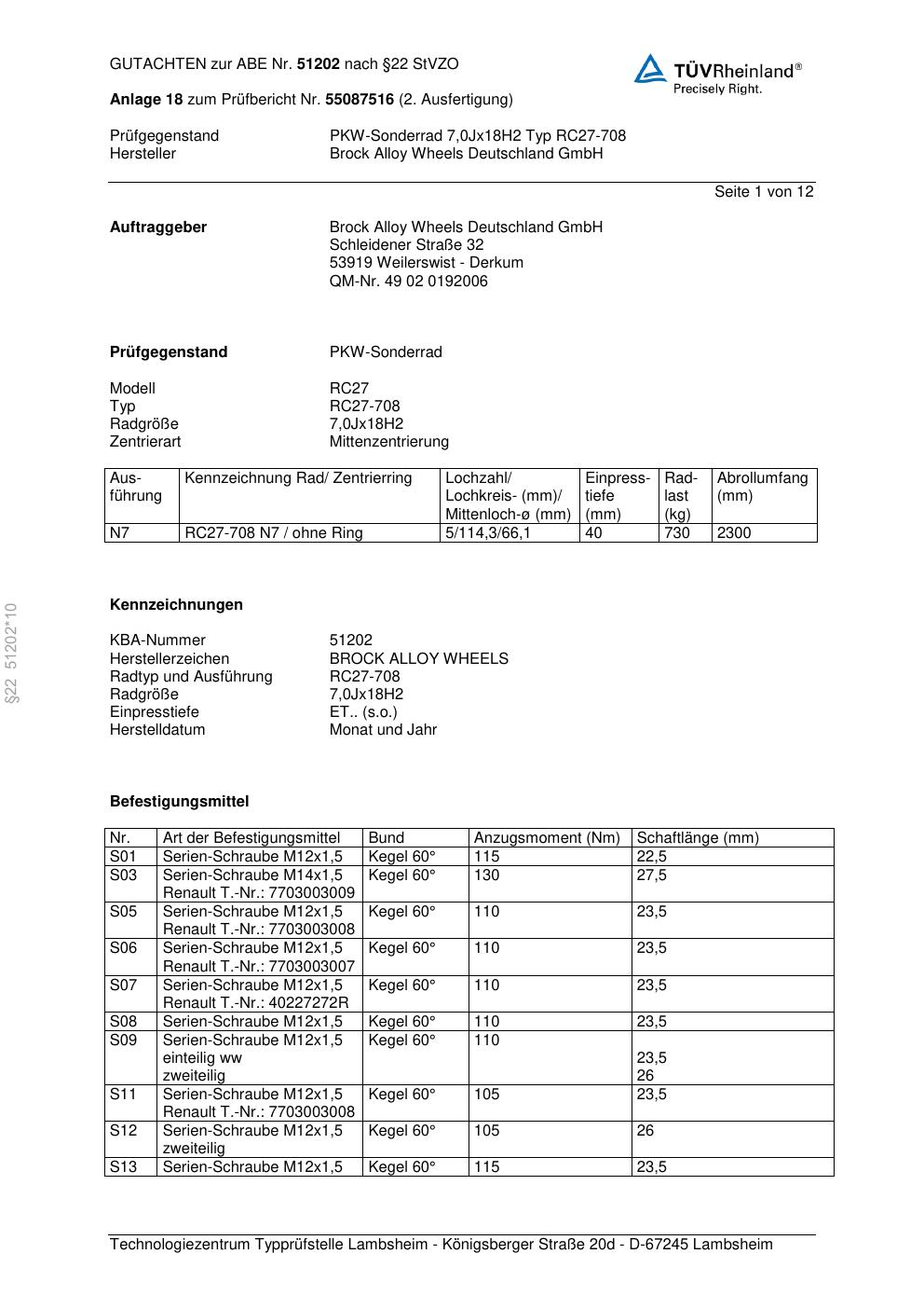 Dieses Gutachten (abe) bezieht sich auf die Alufelge Brock RC27-708 in der Ausführung 7Jx18 ET 0, Mittenloch 0 mm (KBA 51202). Im PDF findest du typischerweise zulässige Reifengrößen, Auflagen/Anbauhinweise und – je nach Dokument – Hinweise zur Eintragung.