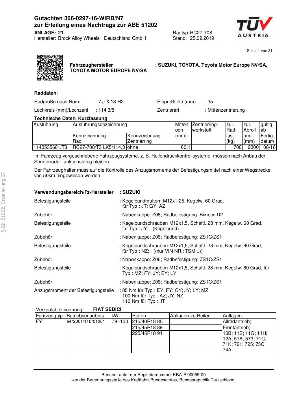 Dieses Gutachten (abe) bezieht sich auf die Alufelge Brock RC27-708 in der Ausführung 7Jx18 ET 0, Mittenloch 0 mm (KBA 51202). Im PDF findest du typischerweise zulässige Reifengrößen, Auflagen/Anbauhinweise und – je nach Dokument – Hinweise zur Eintragung.