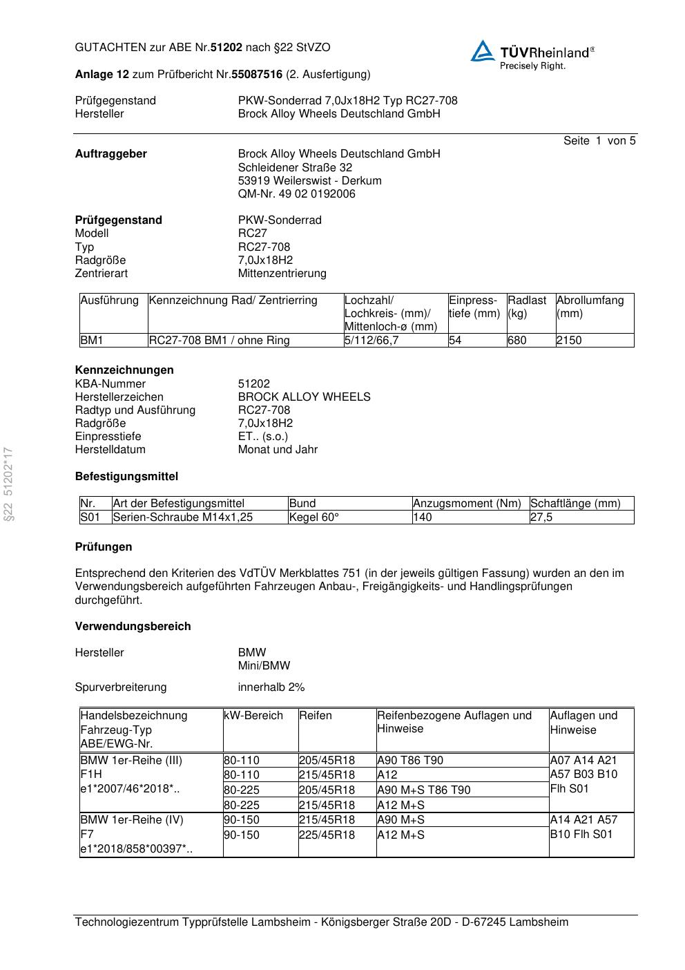 Dieses Gutachten (abe) bezieht sich auf die Alufelge Brock RC27-708 in der Ausführung 7Jx18 ET 0, Mittenloch 0 mm (KBA 51202). Im PDF findest du typischerweise zulässige Reifengrößen, Auflagen/Anbauhinweise und – je nach Dokument – Hinweise zur Eintragung.