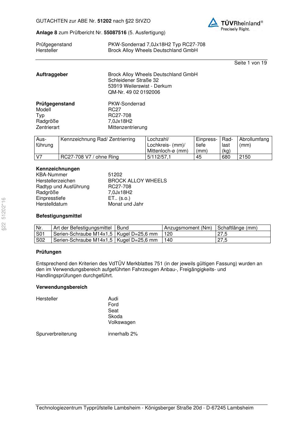 Dieses Gutachten (abe) bezieht sich auf die Alufelge Brock RC27-708 in der Ausführung 7Jx18 ET 0, Mittenloch 0 mm (KBA 51202). Im PDF findest du typischerweise zulässige Reifengrößen, Auflagen/Anbauhinweise und – je nach Dokument – Hinweise zur Eintragung.