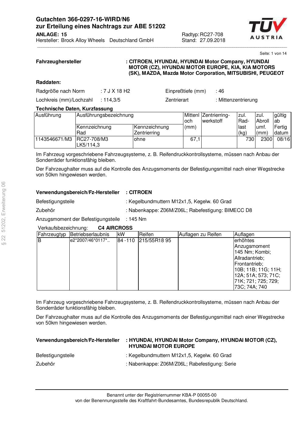 Dieses Gutachten (abe) bezieht sich auf die Alufelge Brock RC27-708 in der Ausführung 7Jx18 ET 0, Mittenloch 0 mm (KBA 51202). Im PDF findest du typischerweise zulässige Reifengrößen, Auflagen/Anbauhinweise und – je nach Dokument – Hinweise zur Eintragung.