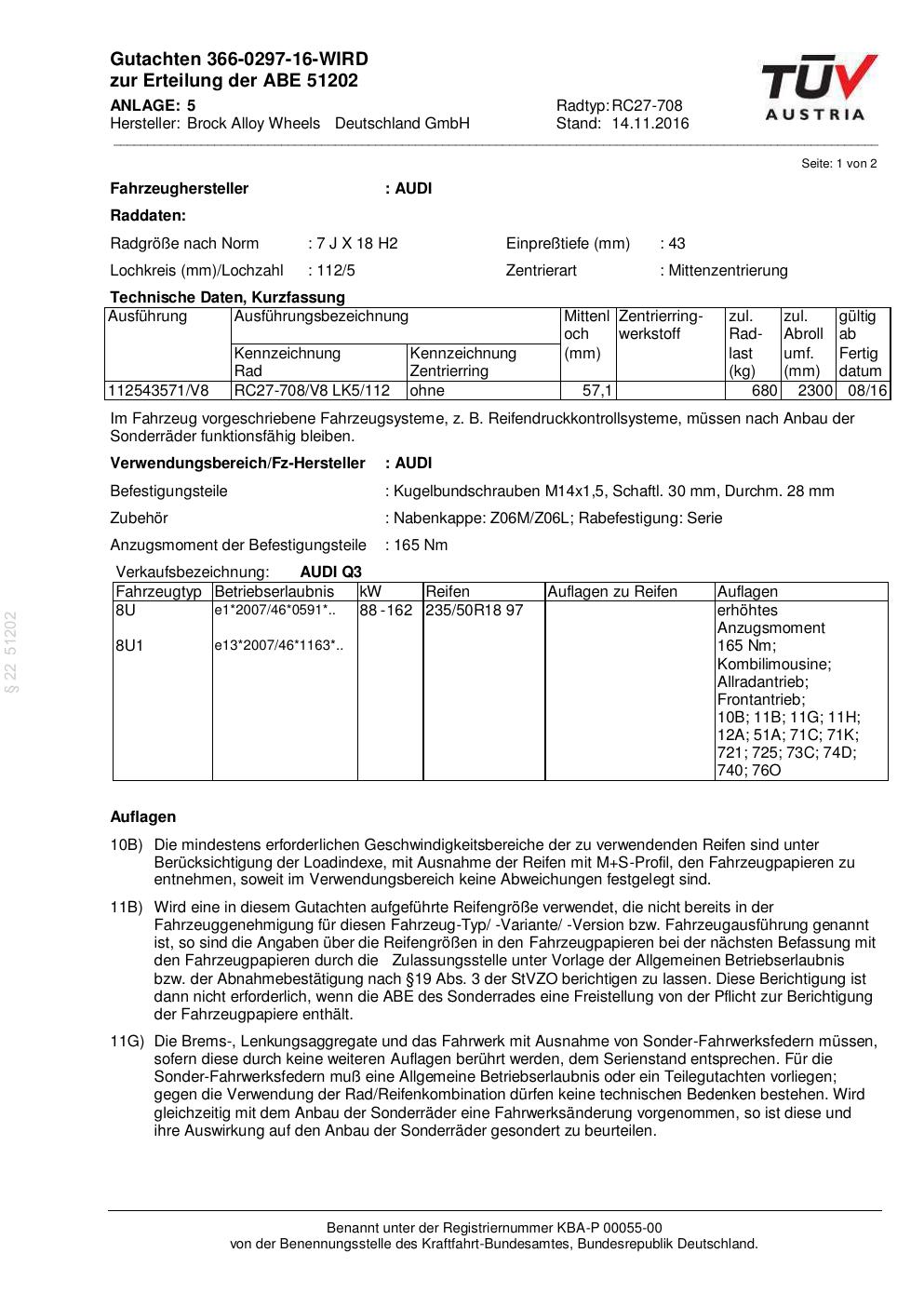 Dieses Gutachten (abe) bezieht sich auf die Alufelge Brock RC27-708 in der Ausführung 7Jx18 ET 0, Mittenloch 0 mm (KBA 51202). Im PDF findest du typischerweise zulässige Reifengrößen, Auflagen/Anbauhinweise und – je nach Dokument – Hinweise zur Eintragung.