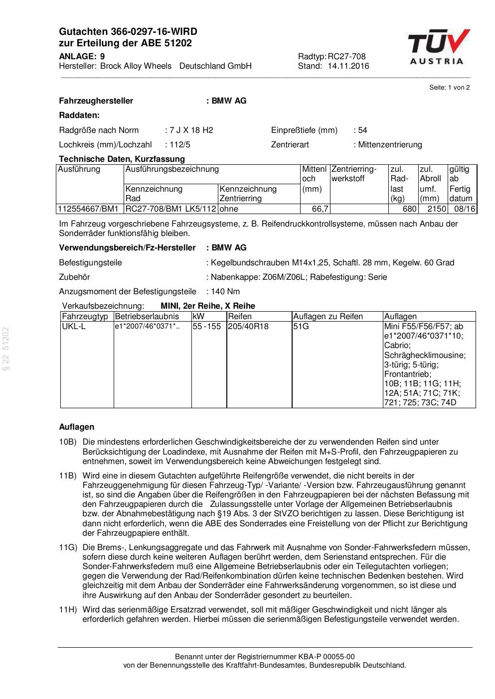 Dieses Gutachten (abe) bezieht sich auf die Alufelge Brock RC27-708 in der Ausführung 7Jx18 ET 0, Mittenloch 0 mm (KBA 51202). Im PDF findest du typischerweise zulässige Reifengrößen, Auflagen/Anbauhinweise und – je nach Dokument – Hinweise zur Eintragung.