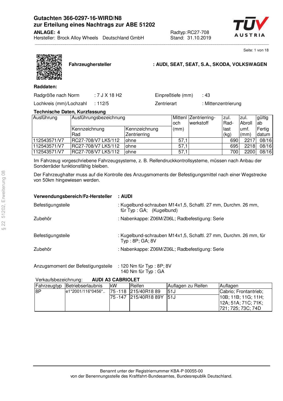 Dieses Gutachten (abe) bezieht sich auf die Alufelge Brock RC27-708 in der Ausführung 7Jx18 ET 0, Mittenloch 0 mm (KBA 51202). Im PDF findest du typischerweise zulässige Reifengrößen, Auflagen/Anbauhinweise und – je nach Dokument – Hinweise zur Eintragung.