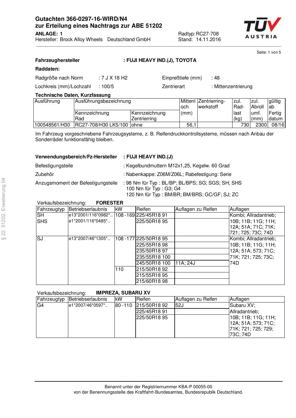 Dieses Gutachten (abe) bezieht sich auf die Alufelge Brock RC27-708 in der Ausführung 7Jx18 ET 0, Mittenloch 0 mm (KBA 51202). Im PDF findest du typischerweise zulässige Reifengrößen, Auflagen/Anbauhinweise und – je nach Dokument – Hinweise zur Eintragung.