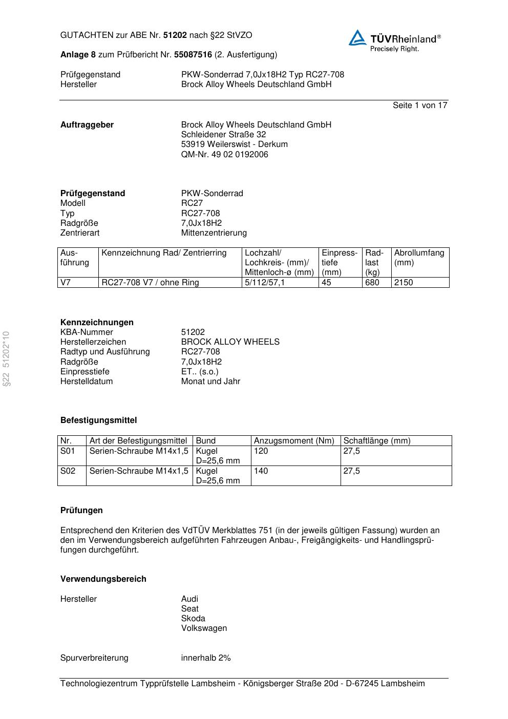 Dieses Gutachten (abe) bezieht sich auf die Alufelge Brock RC27-708 in der Ausführung 7Jx18 ET 0, Mittenloch 0 mm (KBA 51202). Im PDF findest du typischerweise zulässige Reifengrößen, Auflagen/Anbauhinweise und – je nach Dokument – Hinweise zur Eintragung.