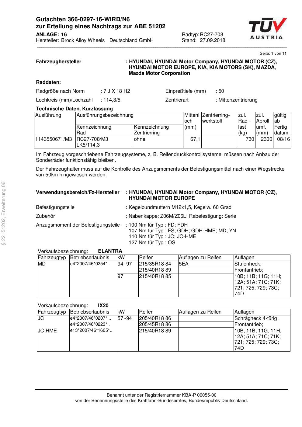 Dieses Gutachten (abe) bezieht sich auf die Alufelge Brock RC27-708 in der Ausführung 7Jx18 ET 0, Mittenloch 0 mm (KBA 51202). Im PDF findest du typischerweise zulässige Reifengrößen, Auflagen/Anbauhinweise und – je nach Dokument – Hinweise zur Eintragung.