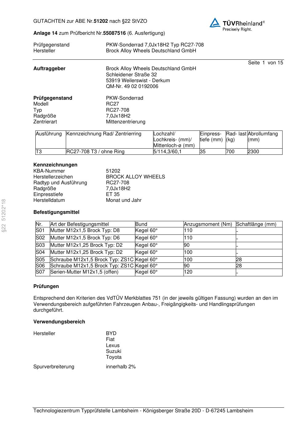 Dieses Gutachten (abe) bezieht sich auf die Alufelge Brock RC27-708 in der Ausführung 7Jx18 ET 0, Mittenloch 0 mm (KBA 51202). Im PDF findest du typischerweise zulässige Reifengrößen, Auflagen/Anbauhinweise und – je nach Dokument – Hinweise zur Eintragung.