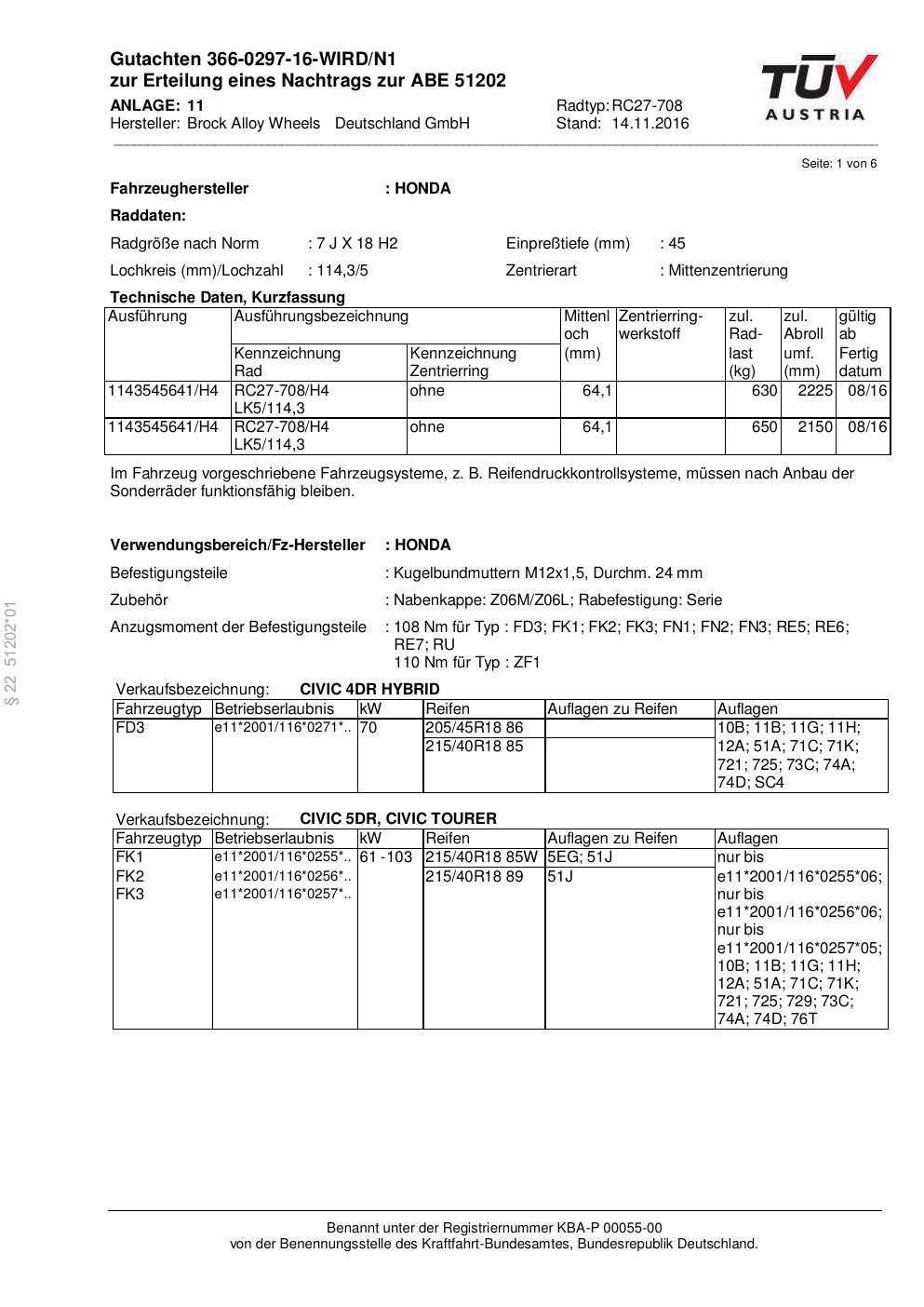 Dieses Gutachten (abe) bezieht sich auf die Alufelge Brock RC27-708 in der Ausführung 7Jx18 ET 0, Mittenloch 0 mm (KBA 51202). Im PDF findest du typischerweise zulässige Reifengrößen, Auflagen/Anbauhinweise und – je nach Dokument – Hinweise zur Eintragung.