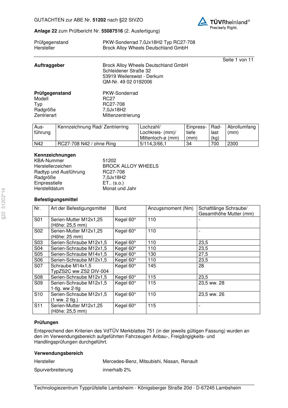 Dieses Gutachten (abe) bezieht sich auf die Alufelge Brock RC27-708 in der Ausführung 7Jx18 ET 0, Mittenloch 0 mm (KBA 51202). Im PDF findest du typischerweise zulässige Reifengrößen, Auflagen/Anbauhinweise und – je nach Dokument – Hinweise zur Eintragung.