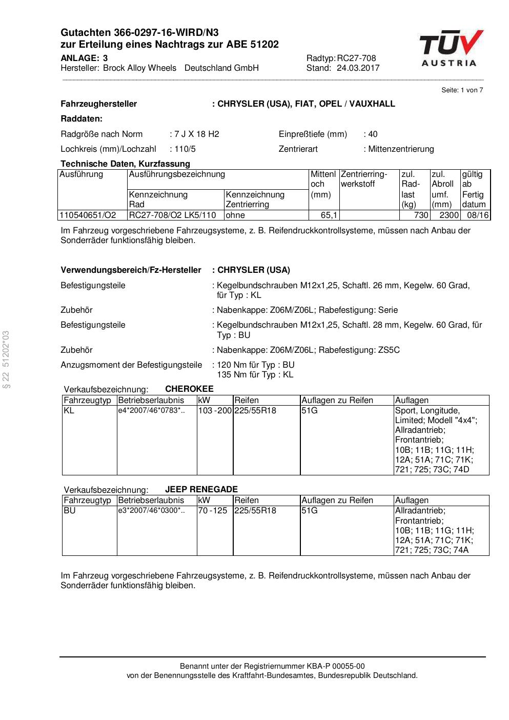 Dieses Gutachten (abe) bezieht sich auf die Alufelge Brock RC27-708 in der Ausführung 7Jx18 ET 0, Mittenloch 0 mm (KBA 51202). Im PDF findest du typischerweise zulässige Reifengrößen, Auflagen/Anbauhinweise und – je nach Dokument – Hinweise zur Eintragung.
