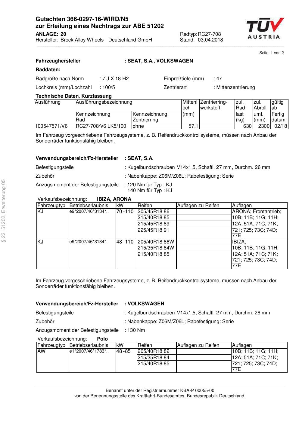 Dieses Gutachten (abe) bezieht sich auf die Alufelge Brock RC27-708 in der Ausführung 7Jx18 ET 0, Mittenloch 0 mm (KBA 51202). Im PDF findest du typischerweise zulässige Reifengrößen, Auflagen/Anbauhinweise und – je nach Dokument – Hinweise zur Eintragung.