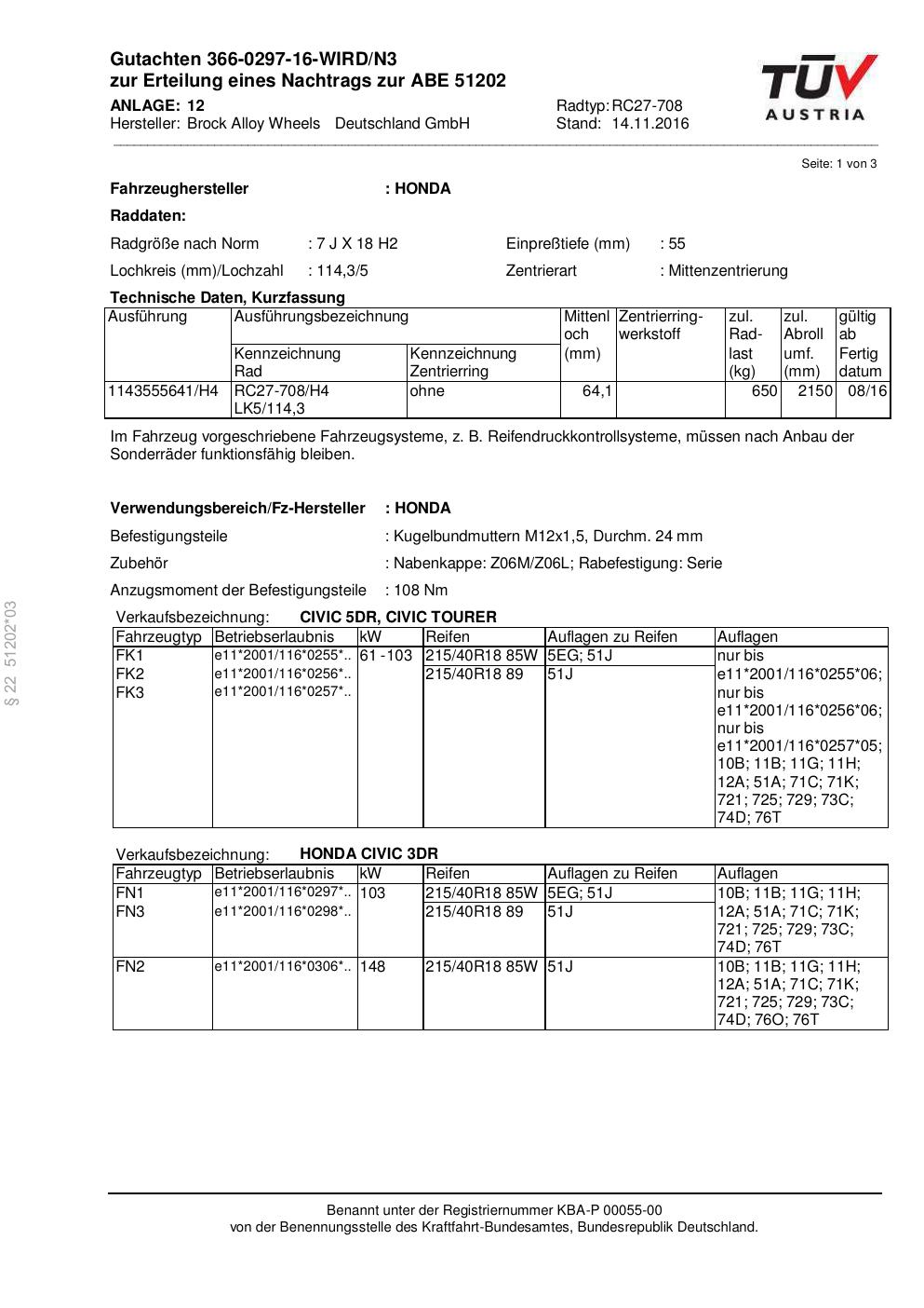 Dieses Gutachten (abe) bezieht sich auf die Alufelge Brock RC27-708 in der Ausführung 7Jx18 ET 0, Mittenloch 0 mm (KBA 51202). Im PDF findest du typischerweise zulässige Reifengrößen, Auflagen/Anbauhinweise und – je nach Dokument – Hinweise zur Eintragung.