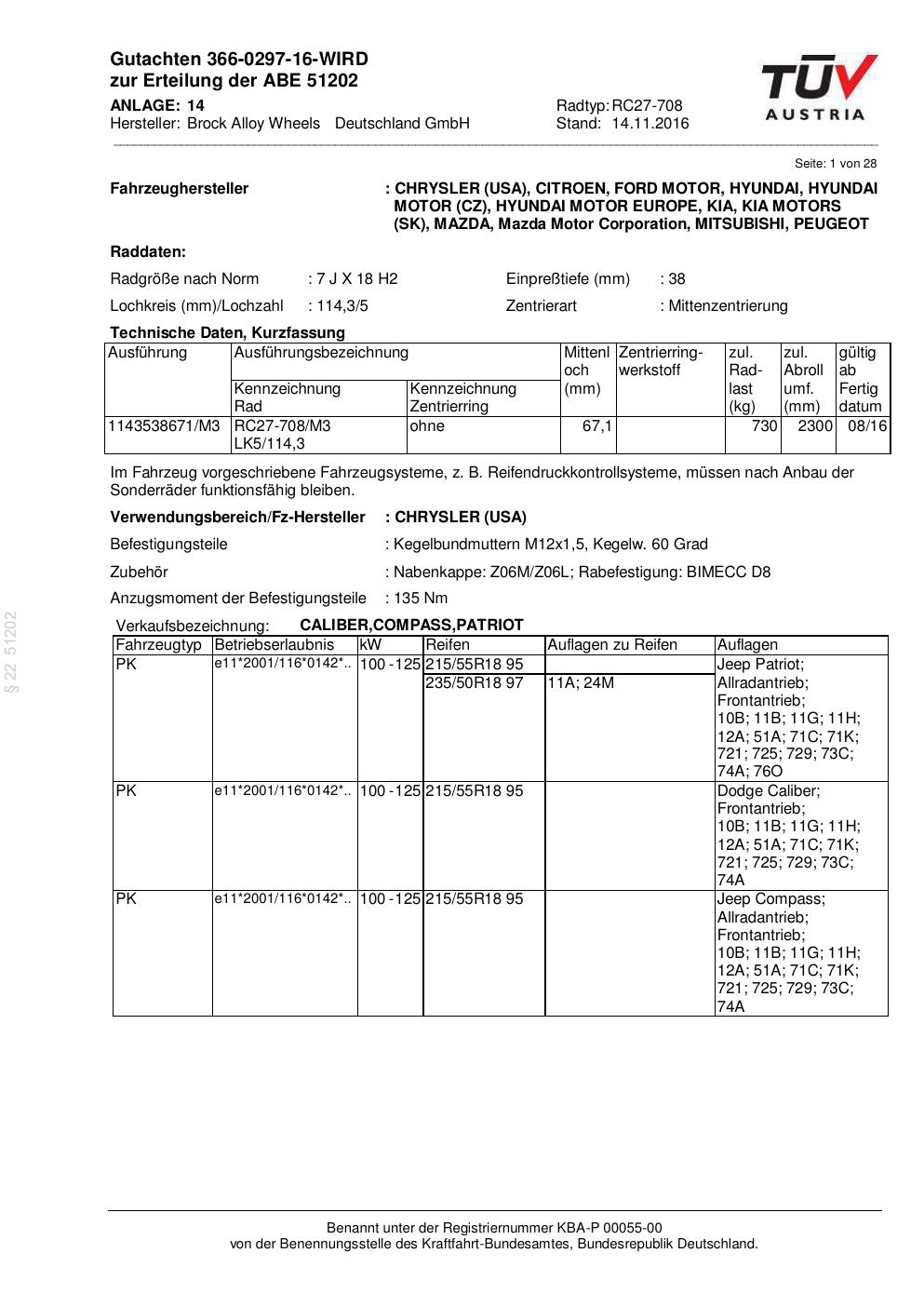 Dieses Gutachten (abe) bezieht sich auf die Alufelge Brock RC27-708 in der Ausführung 7Jx18 ET 0, Mittenloch 0 mm (KBA 51202). Im PDF findest du typischerweise zulässige Reifengrößen, Auflagen/Anbauhinweise und – je nach Dokument – Hinweise zur Eintragung.