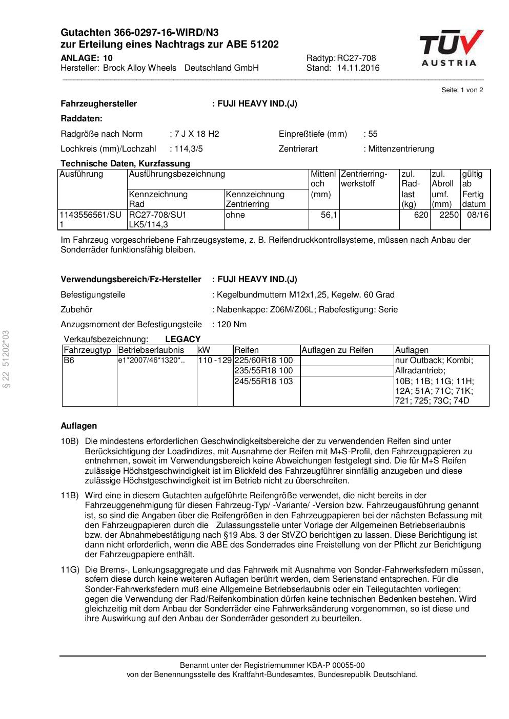 Dieses Gutachten (abe) bezieht sich auf die Alufelge Brock RC27-708 in der Ausführung 7Jx18 ET 0, Mittenloch 0 mm (KBA 51202). Im PDF findest du typischerweise zulässige Reifengrößen, Auflagen/Anbauhinweise und – je nach Dokument – Hinweise zur Eintragung.
