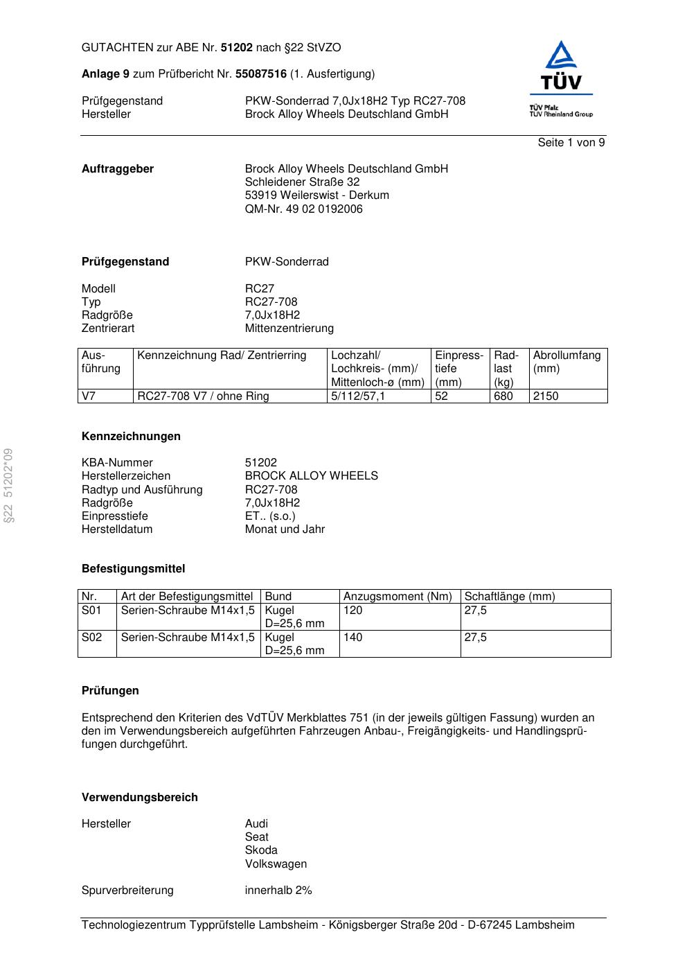 Dieses Gutachten (abe) bezieht sich auf die Alufelge Brock RC27-708 in der Ausführung 7Jx18 ET 0, Mittenloch 0 mm (KBA 51202). Im PDF findest du typischerweise zulässige Reifengrößen, Auflagen/Anbauhinweise und – je nach Dokument – Hinweise zur Eintragung.
